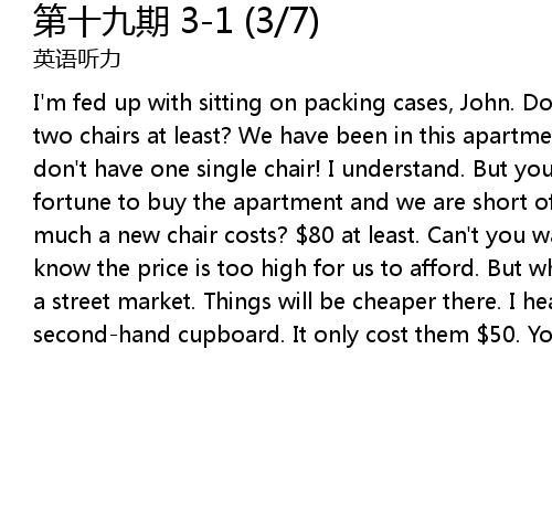 | I'm fed up with sitting on packing cases, John. Don't you think we should buy two chairs at least? We have been in this apartment for two months and we still don't have one single chair! I understand. But you know it costs us such a fortune to buy the apartment and we are short of money recently. Do you know how much a new chair costs? $80 at least. Can't you wait for another month? Yes, I know the price is too high for us to afford. But why don't we look for chairs on a street market. Things will be cheaper there. I heard that the Smiths bought a second-hand cupboard. It only cost them $50. You know it's $40 cheaper at least. |