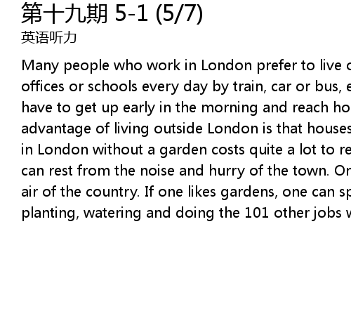 | Many people who work in London prefer to live outside it, and to go in to their offices or schools every day by train, car or bus, even though this means they have to get up early in the morning and reach home late in the evening. One advantage of living outside London is that houses are cheaper. Even a small flat in London without a garden costs quite a lot to rent. Then, in the country one can rest from the noise and hurry of the town. One can enjoy the fresh, clean air of the country. If one likes gardens, one can spend one's free time digging, planting, watering and doing the 101 other jobs which are needed in a garden. |