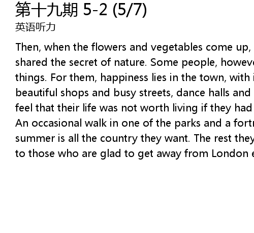 | Then, when the flowers and vegetables come up, one has the reward of one who has shared the secret of nature. Some people, however, take no interest in country things. For them, happiness lies in the town, with its cinemas and theatres, beautiful shops and busy streets, dance halls and restaurants. Such people would feel that their life was not worth living if they had to live it outside London. An occasional walk in one of the parks and a fortnight's visit to the sea every summer is all the country they want. The rest they are quite prepared to leave to those who are glad to get away from London every night. |