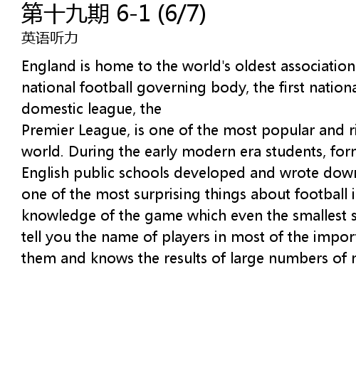 Premier League, is one of the most popular and richest sports leagues in the world. During the early modern era students, former students and teachers at English public schools developed and wrote down the first codes of football. So one of the most surprising things about football in England is the great knowledge of the game which even the smallest schoolboy seems to have. He can tell you the name of players in most of the important teams. He has pictures of them and knows the results of large numbers of matches.