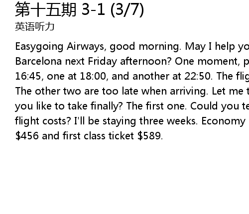 | Easygoing Airways, good morning. May I help you? Yes, do you have any flights to Barcelona next Friday afternoon? One moment, please. Yes, there is a flight at 16:45, one at 18:00, and another at 22:50. The flight at 16:45 would be fine. The other two are too late when arriving. Let me think again. Which one would you like to take finally? The first one. Could you tell me how much a return flight costs? I'll be staying three weeks. Economy class is $346, business class $456 and first class ticket $589. |