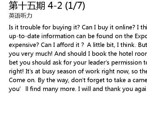 | Is it trouble for buying it? Can I buy it online? I think it' s not very hard and uptodate information can be found on the Expo hotline: 21962010. Is it expensive? Can I afford it? A little bit, I think. But it' s worthy. OK, thank you very much! And should I book the hotel room there earlier? I think so, but I bet you should ask for your leader' s permission to leave first. Absolutely right! It' s at busy season of work right now, so the permission odds are small. Come on. By the way, don' t forget to take a camera fully charged. Go inside and you' ll find many more. I will and thank you again for sharing! |