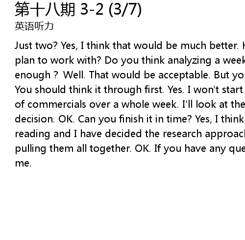 | Just two? Yes, I think that would be much better. How many commercials do you plan to work with? Do you think analyzing a week of commercials would be enough? Well. That would be acceptable. But you'd better not haste to start. You should think it through first. Yes. I won't start before I collect a sample of commercials over a whole week. I'll look at them and then make a final decision. OK. Can you finish it in time? Yes, I think so. I've finished the reading and I have decided the research approach. So it's just a matter of pulling them all together. OK. If you have any question, don't hesitate to ask me. |