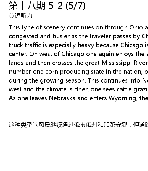 | This type of scenery continues on through Ohio and Indiana, but the road becomes congested and busier as the traveler passes by Chicago on northern Illinois. The truck traffic is especially heavy because Chicago is an important business center. On west of Chicago one again enjoys the scenery of the rich agricultural lands and then crosses the great Mississippi River into Iowa. Since Iowa is the number one corn producing state in the nation, one sees vast fields of corn during the growing season. This continues into Nebraska, but as one gets further west and the climate is drier, one sees cattle grazing on the grasslands there. As one leaves Nebraska and enters Wyoming, the beautiful Rocky Mountains appear. | |