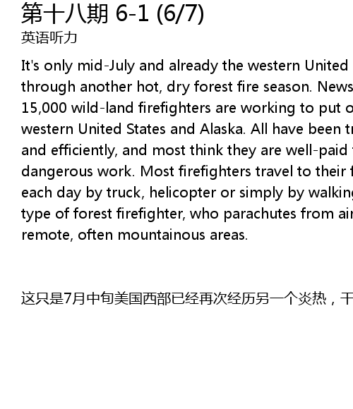 | It' s only midJuly and already the western United States is once again suffering through another hot, dry forest fire season. Newspaper says that presently about 15, 000 wildland firefighters are working to put out forest fires burning in the western United States and Alaska. All have been trained to do their jobs safely and efficiently, and most think they are wellpaid to do the hard and sometimes dangerous work. Most firefighters travel to their forest fire work assignments each day by truck, helicopter or simply by walking. A smoke jumper is a special type of forest firefighter, who parachutes from airplanes to work on fires in remote, often mountainous areas. | |