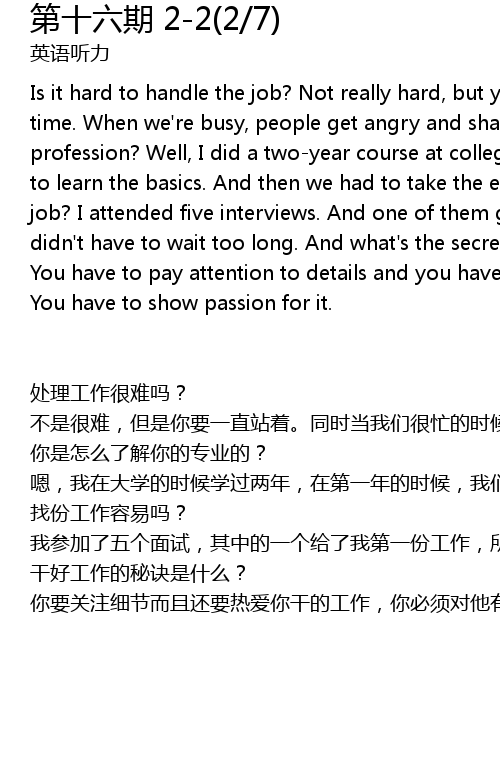 | 处理工作很难吗? 不是很难,但是你要一直站着。同时当我们很忙的时候,人们会变得很生气和尖锐。 你是怎么了解你的专业的? 嗯,我在大学的时候学过两年,在第一年的时候,我们一定要学习基础知识,然后还要考试。 找份工作容易吗? 我参加了五个面试,其中的一个给了我第一份工作,所以我不用等很长时间。 干好工作的秘诀是什么? 你要关注细节而且还要热爱你干的工作,你必须对他有激情。 |