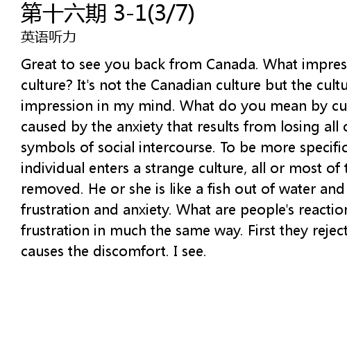 | Great to see you back from Canada. What impressed you most of the Canadian culture? It's not the Canadian culture but the culture shock that left a great impression in my mind. What do you mean by culture shock? Culture shock is caused by the anxiety that results from losing all our familiar signs and symbols of social intercourse. To be more specific, what is it? When an individual enters a strange culture, all or most of these familiar signs are removed. He or she is like a fish out of water and tend to have a feeling of frustration and anxiety. What are people's reactions? People react to the frustration in much the same way. First they reject the environment, which causes the discomfort. I see. |