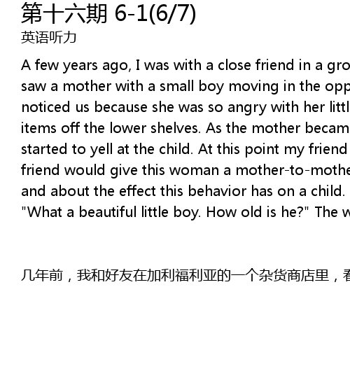 | 几年前,我和好友在加利福利亚的一个杂货商店里,看见一个女人和她的小男孩往相反的方向走去,这个女人没有注意到我们因为她对小男孩很生气,这个小男孩想把东西从较低的架子上拿下来。当这个母亲变得越来越生气的时候,她开始对着小男孩大喊,这个时候我的朋友要阻止她了,我期待我的朋友能给她来次母亲间的对话,有关控制自己和这样大喊的行为会对孩子造成的影响,然而,取而代之的是,我的朋友对着这位母亲说,多漂亮的一个孩子呀,他几岁了?那位母亲回答说,他三岁了。 |