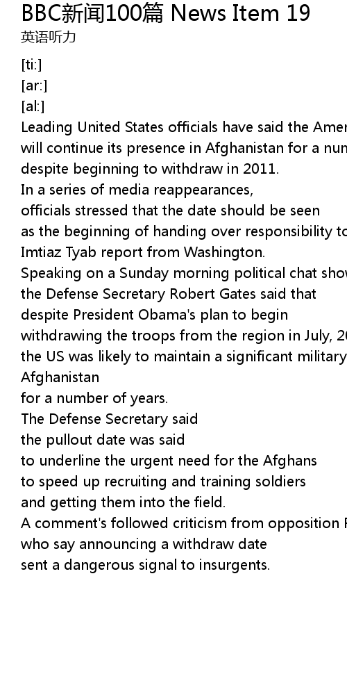 | [00:30.32] | the US was likely to maintain a significant military presence in Afghanistan |