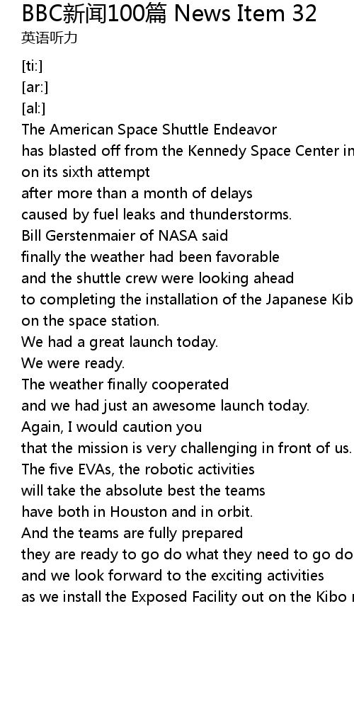 | [00:21.12] | to completing the installation of the Japanese Kibo laboratory |