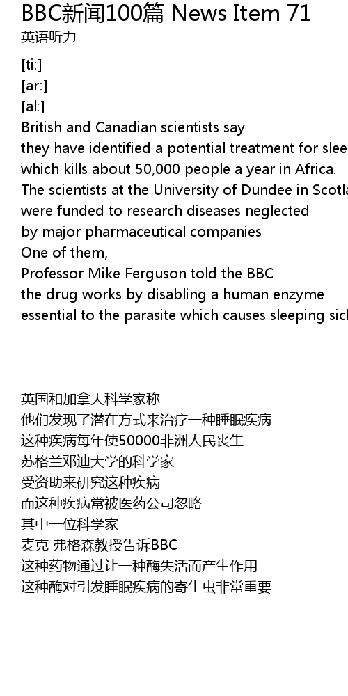 | [00:02.11] | they have identified a potential treatment for sleeping sickness |