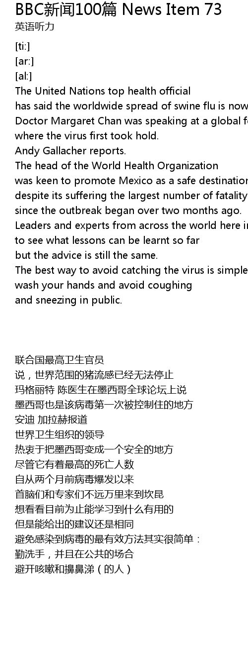 | [00:03.67] | has said the worldwide spread of swine flu is now unstoppable. |