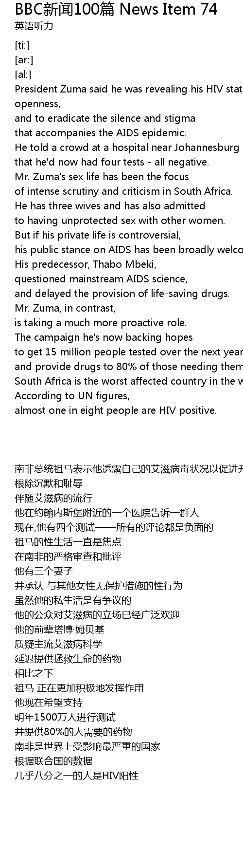 | [00:00.00] | President Zuma said he was revealing his HIV status to promote openness, |