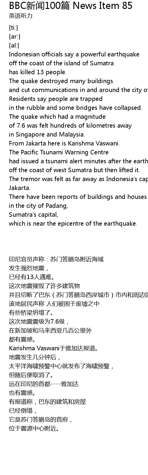 | [00:30.01] | off the coast of west Sumatra but then lifted it. |