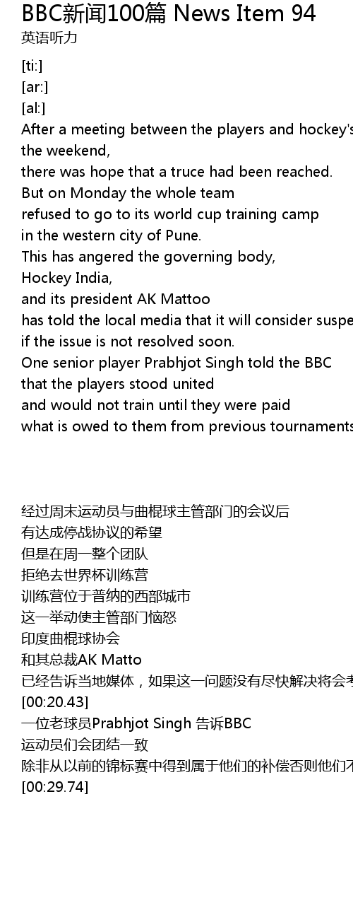 | [00:22.57] | One senior player Prabhjot Singh told the BBC |