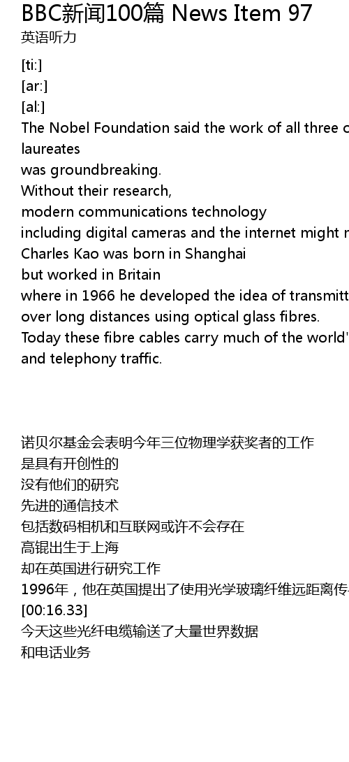 | [00:00.00] | The Nobel Foundation said the work of all three of this year's physics laureates |