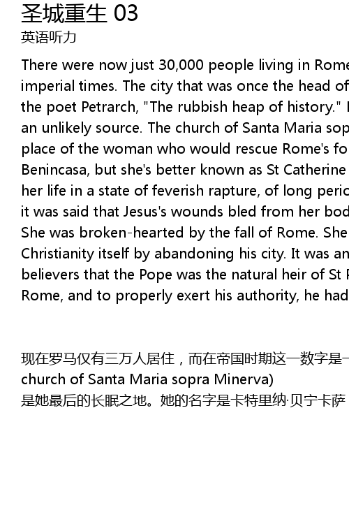 | There were now just 30, 000 people living in Rome, compared to a million in imperial times. The city that was once the head of the world had become, wrote the poet Petrarch, " The rubbish heap of history." But salvation would come from an unlikely source. The church of Santa Maria sopra Minerva is the final resting place of the woman who would rescue Rome' s fortunes. Her name was Caterina Benincasa, but she' s better known as St Catherine of Siena. She spent much of her life in a state of feverish rapture, of long periods of deep meditation, and it was said that Jesus' s wounds bled from her body. In 1370, Catherine was 23. She was brokenhearted by the fall of Rome. She believed the Pope had betrayed Christianity itself by abandoning his city. It was an article of faith for believers that the Pope was the natural heir of St Peter, the first Bishop of Rome, and to properly exert his authority, he had to rule from the Holy City. | |