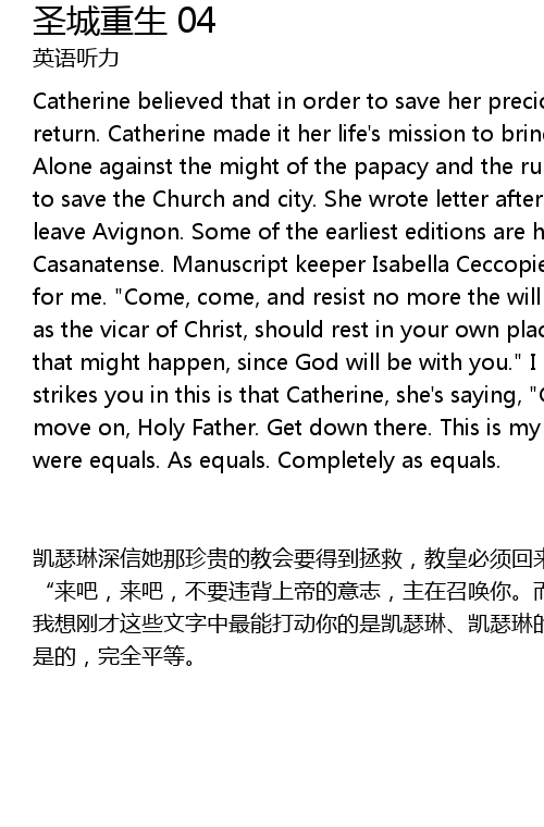 | 凯瑟琳深信她那珍贵的教会要得到拯救,教皇必须回来主持大局。凯瑟琳将把教皇请入罗马作为她毕生的责任。为了拯救教会和这座城市,凯瑟琳和这些掌权者斗争,这些掌权者有的是教皇、有的是欧洲的统治者,她一个人苦苦支撑。她不停地写信给教皇,一封接一封,请教皇离开阿维尼翁来到罗马。这些书信就保存在这:卡萨纳特图书馆。手稿保管员伊莎贝拉切克皮耶里已经同意为我翻译这些手稿。 “来吧,来吧,不要违背上帝的意志,主在召唤你。而你,上帝麾下的牧师,应当安歇在你自己的地方。不要畏惧还未发生的事情。上帝将与你同在。” 我想刚才这些文字中最能打动你的是凯瑟琳、凯瑟琳的话语。“快点啊,教皇。快点啊,圣父。请到这里来。这是我个人的请求。”好像他们是平等的。 是的,完全平等。 |