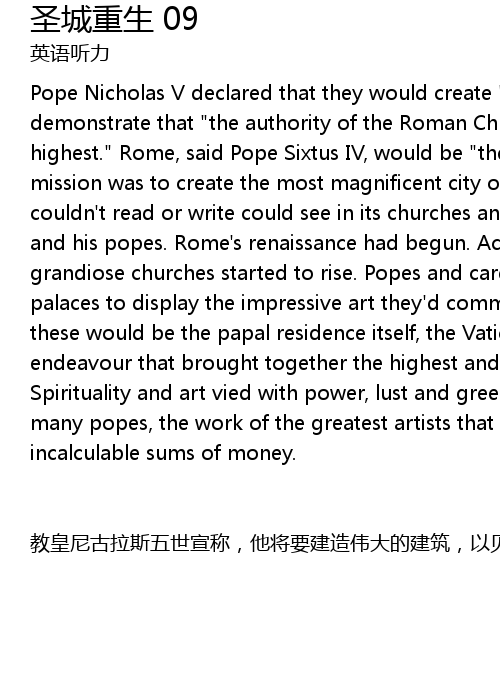 | 教皇尼古拉斯五世宣称,他将要建造伟大的建筑,以见证罗马教会之权威乃是最伟大和最高的。教皇希克斯塔斯四世说,罗马将成为世界之都。其使命就是建造世界上最宏伟的城市,这样那些不会认字和写字的朝圣者们便能够在教堂和宫殿中见证上帝极其教皇们的光辉。罗马的文艺复兴开始了。宏伟的教堂升起一个个穹顶,划过天际。教皇们和红衣主教们建造起最奢华的宫殿以承载那些他们所经手的令人震撼的艺术。其中最巧夺天工的就是教皇的官邸本身,梵蒂冈。它令人惊讶地努力将人类高尚和低级之趣味融合在了一起。精神和艺术同权利,欲望,贪婪相纷争。这件工程得到了多位教皇的赞助,许多世界上最伟大的艺术家参与其中,同时也耗费了大量的金钱。 |