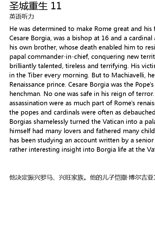 | 他决定振兴罗马、兴旺家族。他的儿子恺撒·博尔吉亚16岁成为主教,18岁成为红衣主教。不过他因涉嫌谋杀自己的弟弟而退位让贤之后便成为教皇军统领,为家族南征北讨。他才干出众、精力充沛、残暴冷酷。早晨台伯河里的浮尸告诉人们反对他的下场。然而就马吉雅维利的观点而言,他是文艺复兴时期最理想的王子。凯撒博尔吉亚是教皇权利的执行者和忠实追随者。在他的恐怖统治下无人能够幸免。在文艺复兴时期,罗马以艺术而令人称道,然而这里也却藏污纳垢:贪污腐败、战争和刺杀层出不穷。这里的主教和红衣主教在做僧侣时就生活奢靡。博尔吉亚家族将梵蒂冈变成了“极乐宫”却没有感到丝毫羞愧。教皇本人蓄养了不少姬妾,和他们生了许多孩子。历史学家玛丽霍林斯沃斯正在研究一本手册,这本手册是当年一位重臣所录,他对博尔吉亚家族在梵蒂冈的生活十分关注。 |