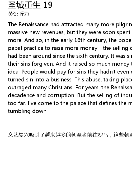 | 文艺复兴吸引了越来越多的朝圣者前往罗马,这些朝圣者们也给罗马带来了新的巨额财政收入,但是这些钱很快就被花完了,因为这些钱根本填不饱教会的肚子。于是,16世纪初,教皇们开始发掘一种特别的教皇业务来筹措更多的资金——出售宽恕。这种业务6世纪就已经有了。很简单。人们花钱以使他们的罪过得到宽恕。出售宽恕赚得是盘满钵满,他们甚至想出了一个更聪明点子。人们可以花钱去提前宽恕他们还没犯的罪过。教皇把罪过变成了一项生意。对罪过的滥用发生在上帝之城的中心,这激怒了很多基督徒。多年以来,文艺复兴时期的教皇们靠堕落和腐败兴旺发达。但是出售宽恕结果是有点太过了。我去过一个宫殿,描绘出当时文艺复兴时期罗马城摇摇欲坠的景象。 |