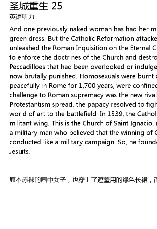 | 原本赤裸的画中女子,也穿上了遮羞用的绿色长裙,而显得邋遢不堪。然而宗教改革对此攻击甚多甚至超出了艺术的范畴。这放纵永恒之城的宗教裁判所,它们开始滥用职权。宗教裁判所建立原是为了监督教堂执行基督教义破坏异教组织以及驱除城中的“污秽”。此时,一些微小的罪行被放大了,文艺复兴时期放荡不羁之人被粗暴地惩罚。同性恋人被活活烧死。犹太人已罗马平静地生存了1700年,此时也被裁判所的逼迫下搬入贫民区。然而对罗马至高无上权势的巨大挑战是基督教的新派别,它是反对罗马教会的。新教四处传播,教皇下定决心在各个方面对新教进行坚决打击,从艺术领域到战场。1539年,天主教会诞下了激进主义这一婴儿。这里是圣依纳爵大教堂,是以伊纳爵·罗耀拉的名字命名的。伊纳爵·罗耀拉是一个军人,他坚信取得基督教灵修的胜利得像进行军事部署那样计划周密。因此他创立了耶稣会,即基督会。 |