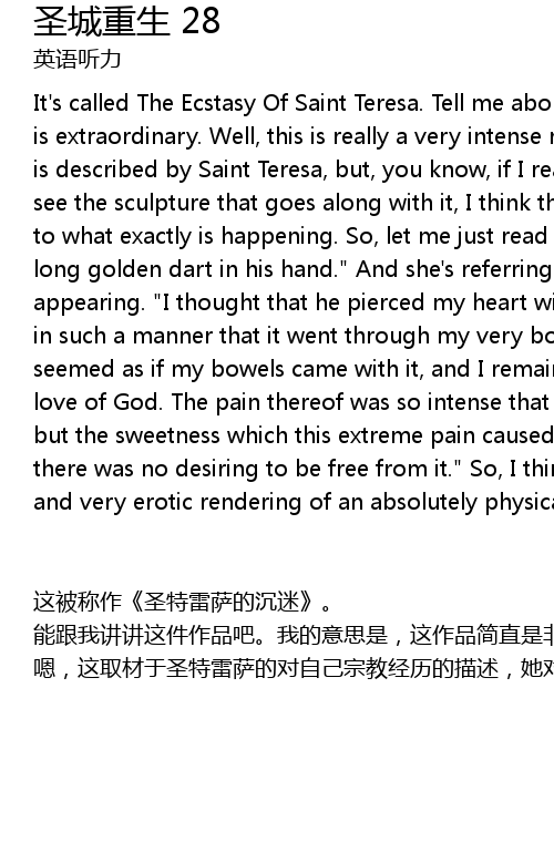 | 这被称作《圣特雷萨的沉迷》。 能跟我讲讲这件作品吧。我的意思是,这作品简直是非同凡响。 嗯,这取材于圣特雷萨的对自己宗教经历的描述,她对此事印象深刻,但是,你应当明白,如果你读了她的那些语录,你就会发现这个雕塑表现的就是这件事情本身。我想这个雕塑可能将这件事情微微夸大了。好了,我们来读读这个。“我看到他的手中握着一杆金色的标枪。”她指的是她看见天使显灵时那个天使。“我想他用那柄金枪数次刺穿我的心脏,于是它刺穿了我的内腑,当他将金枪从我身上抽离时,似乎我的心脏紧附着它。在上帝爱的温暖下,我仍然全身红肿。痛:身体是那么疼痛,我不由得呻吟出声。但是甜:尽管这会儿我的体内是如此疼痛,我却一点也不想从他的金枪下逃脱。”因此,我想她的这场身体的经历描述的栩栩如生,但又带着如此明显的性暗示。 |