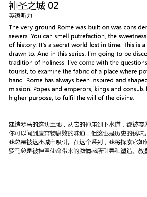 | The very ground Rome was built on was considered sacred, from its temples to its sewers. You can smell putrefaction, the sweetness of waste. But it also stinks of history. It' s a secret world lost in time. This is a city I' ve always been drawn to. And in this series, I' m going to be discovering just how it gained its tradition of holiness. I' ve come with the questions of both historian and tourist, to examine the fabric of a place where power and religion go hand in hand. Rome has always been inspired and shaped by its passionate sense of sacred mission. Popes and emperors, kings and consuls have all believed they served a higher purpose, to fulfil the will of the divine. | |
