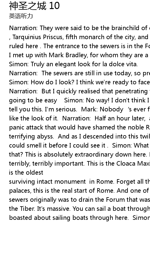 | Narration: The sewers are still in use today, so precautions have to be taken. Simon: How do I look? I think we' re ready to face the effluvia of the ancients. Narration: But I quickly realised that penetrating these faecal caverns wasn' t going to be easy Simon: No way! I don' t think I can go down there. I hate to tell you this. I' m serious. Mark: Nobody' s ever fallen down it. Simon: Don' t like the look of it. Narration: Half an hour later, after a very 21stcentury panic attack that would have shamed the noble Romans, I managed to face this terrifying abyss. And as I descended into this twilight canyon of filth, I could smell it before I could see it . Simon: What a place! Oh, my God! What is that? This is absolutely extraordinary down here. Mark: Yes, I mean, these are terribly, terribly important. This is the Cloaca Maxima, the great sewer, which is the oldest | |