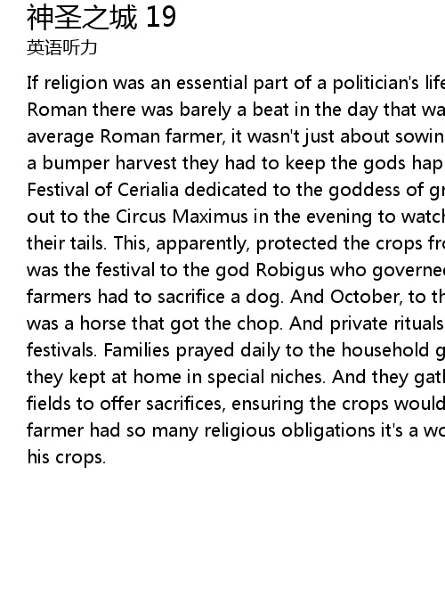 | If religion was an essential part of a politician's life, for your ordinary Roman there was barely a beat in the day that wasn't overseen by a god. For the average Roman farmer, it wasn't just about sowing, ploughing and reaping. To get a bumper harvest they had to keep the gods happy, too. In April there was the Festival of Cerialia dedicated to the goddess of grain, which involved heading out to the Circus Maximus in the evening to watch foxes with torches tied to their tails. This, apparently, protected the crops from vermin. And then there was the festival to the god Robigus who governed mildew. To avoid an outbreak, farmers had to sacrifice a dog. And October, to thank Mars for the harvest, it was a horse that got the chop. And private rituals were as important as public festivals. Families prayed daily to the household gods, the Lares, whose statues they kept at home in special niches. And they gathered for ceremonies in the fields to offer sacrifices, ensuring the crops would ripen. In fact, the Roman farmer had so many religious obligations it's a wonder he had any time to tend his crops. |