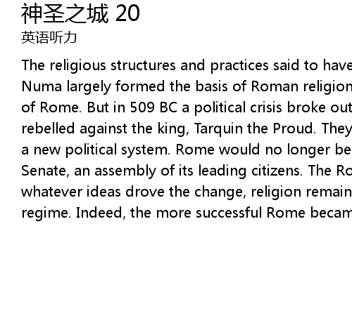 | The religious structures and practices said to have been established by King Numa largely formed the basis of Roman religion for the entire first millennium of Rome. But in 509 BC a political crisis broke out. A group of aristocrats rebelled against the king, Tarquin the Proud. They overthrew him and established a new political system. Rome would no longer be ruled by one man but by the Senate, an assembly of its leading citizens. The Roman Republic was born. But whatever ideas drove the change, religion remained at the heart of the new regime. Indeed, the more successful Rome became, the more sacred the city. |