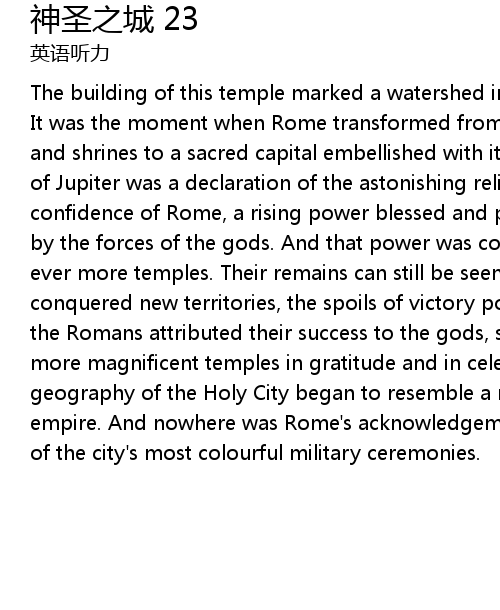 | The building of this temple marked a watershed in the history of the Holy City. It was the moment when Rome transformed from being a town of small-scale temples and shrines to a sacred capital embellished with its own cathedral. The Temple of Jupiter was a declaration of the astonishing religious and political confidence of Rome, a rising power blessed and propelled on its sacred destiny by the forces of the gods. And that power was consolidated by the raising of ever more temples. Their remains can still be seen all over Rome. As the Romans conquered new territories, the spoils of victory poured into the city and since the Romans attributed their success to the gods, so the victors built more and more magnificent temples in gratitude and in celebration. Gradually the geography of the Holy City began to resemble a map of Rome's ever-increasing empire. And nowhere was Rome's acknowledgement of the gods clearer than in one of the city's most colourful military ceremonies. |