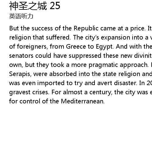 | But the success of the Republic came at a price. It was the purity of Rome's religion that suffered. The city's expansion into a vast empire led to an influx of foreigners, from Greece to Egypt. And with them came their gods. Rome's senators could have suppressed these new divinities and stayed faithful to their own, but they took a more pragmatic approach. Foreign gods, like Isis and Serapis, were absorbed into the state religion and in the third century BC one was even imported to try and avert disaster. In 205 BC, Rome faced one of its gravest crises. For almost a century, the city was engaged in a power struggle for control of the Mediterranean. |