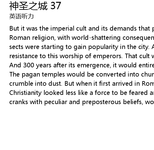 | But it was the imperial cult and its demands that provoked a minor challenge to Roman religion, with world-shattering consequences. A new generation of foreign sects were starting to gain popularity in the city. And one in particular showed resistance to this worship of emperors. That cult was, of course, Christianity. And 300 years after its emergence, it would entirely reshape the city of Rome. The pagan temples would be converted into churches, leaving the Roman gods to crumble into dust. But when it first arrived in Rome, in the first century AD, Christianity looked less like a force to be feared and more like a sect of cranks with peculiar and preposterous beliefs, worthy of mockery. |
