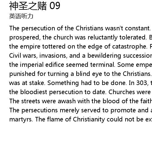 | The persecution of the Christians wasn't constant. When the Roman Empire prospered, the church was reluctantly tolerated. But in the mid third century, the empire tottered on the edge of catastrophe. Rome faced 50 years of disaster. Civil wars, invasions, and a bewildering succession of emperors. The cracks in the imperial edifice seemed terminal. Some emperors believed that Rome was being punished for turning a blind eye to the Christians. The unity of city and empire was at stake. Something had to be done. In 303, the Emperor Diocletian launched the bloodiest persecution to date. Churches were destroyed, bishops decapitated. The streets were awash with the blood of the faithful. But the killings failed. The persecutions merely served to promote and advertise the faith of the martyrs. The flame of Christianity could not be extinguished. |