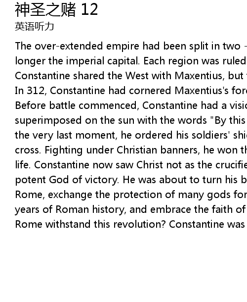 | The over-extended empire had been split in two - East and West. Rome was no longer the imperial capital. Each region was ruled by an emperor and his deputy. Constantine shared the West with Maxentius, but they soon became bitter rivals. In 312, Constantine had cornered Maxentius's forces on the banks of the Tiber. Before battle commenced, Constantine had a vision. He saw the sign of the Cross superimposed on the sun with the words "By this sign, thou shalt conquer". At the very last moment, he ordered his soldiers' shields to be emblazoned with the cross. Fighting under Christian banners, he won the greatest victory of his life. Constantine now saw Christ not as the crucified lamb of God, but as a potent God of victory. He was about to turn his back on everything that had made Rome, exchange the protection of many gods for just one, overturn a thousand years of Roman history, and embrace the faith of persecuted radicals. But could Rome withstand this revolution? Constantine was willing to take that gamble. |