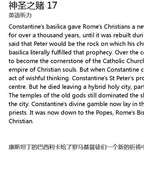 | 康斯坦丁的巴西利卡给了罗马基督徒们一个新的祈祷中心。它矗立达一千多年,直到文艺复兴时代得到重建为止。耶稣说过彼得将成为他教会赖以依靠的基石。康斯坦丁的巴西利卡确实实现了这个预言,(圣彼得大教堂建于圣彼德墓穴的正上方)。多少个世纪过去了,圣彼得大教堂成为了天主教会的基石,以及基督教精神帝国的总部。但是当康斯坦丁委托艺术家建造它时,这些还仅仅是一厢情愿。康斯坦丁的圣彼得大教堂促使罗马成为了基督教的中心。但在他死的时候,留下的是一座教派混合的圣城,一部分是基督教的,但另一部分却是异教徒的。上古之神的庙宇依然映满天际。异教徒依然统治着罗马城。康斯坦丁的神圣一赌现在交由罗马的新主教们来完成,它现在被传承给了教皇——罗马的主教,真正地使罗马城基督教化了。 |