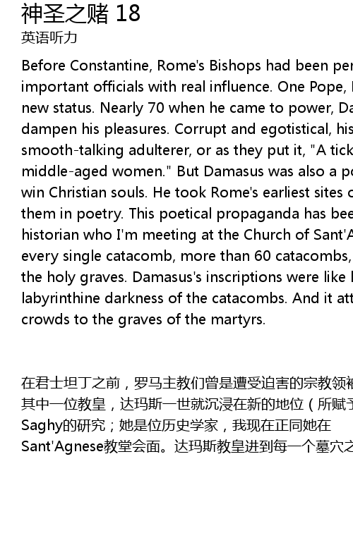 | Before Constantine, Rome' s Bishops had been persecuted leaders. Now they were important officials with real influence. One Pope, Damasus I, revelled in this new status. Nearly 70 when he came to power, Damasus didn' t allow old age to dampen his pleasures. Corrupt and egotistical, his enemies described him as a smoothtalking adulterer, or as they put it, " A tickler of the ears of middleaged women." But Damasus was also a poet who used his literary gifts to win Christian souls. He took Rome' s earliest sites of martyrdom and celebrated them in poetry. This poetical propaganda has been studied by Marianne Saghy, a historian who I' m meeting at the Church of Sant' Agnese. Pope Damasus went into every single catacomb, more than 60 catacombs, placing poetic inscriptions above the holy graves. Damasus' s inscriptions were like huge billboards in the labyrinthine darkness of the catacombs. And it attracted huge throngs, huge crowds to the graves of the martyrs. | |