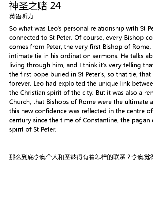 | na me dao di li ao ge ren he sheng bi de you zhe zen yang de lian xi? li ao jue de zi ji he sheng bi de jin mi xiang lian. dang ran, mei ge zhu jiao dou ke yi sheng cheng shi luo ma de di yi ren zhu jiao sheng bi de ci yu le ta men quan li, dan shi li ao zai ta de jiu zhi bu dao yi shi shang ba ta he sheng bi de zhi jian de jin mi lian xi shen hua le. ta shuo sheng bi de de jing shen ji hu jin ru ta de gu sui, ta ye shi di yi wei zang zai sheng bi de da jiao tang de ren, yu shi na ceng jin mi de niu dai, jiang yong yuan cun zai xia qu. li ao fa jue le luo ma cheng yu sheng bi de zhi jian de zhe ceng du yi wu er de niu dai, ye cui sheng le luo ma cheng de ji du jiao jing shen. dan shi zhe ye ti xing le guang da de jiao tu, luo ma cheng de zhu jiao cai shi ji du jiao de zhong ji quan wei. zhe yi xin xin nian hen kuai fan ying dao le cheng shi zhong xin. kang si tan ding shi dai jin jin guo le da yue yi ge shi ji, yi jiao tu zhi cheng xian zai jiu yi jing shou dao le sheng bi de jing shen de gan zhao. |