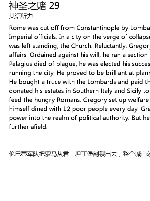 | 伦巴蒂军队把罗马从君士坦丁堡割裂出去;整个城市就这么被帝国官员们撇下。在这座濒临陷落的城市,只有一个组织存留下来——教会。格里高利又一次被卷入民政管理事务,尽管这非他所愿。格里高利不得已受了戒成为圣职人员,而后开始掌管城市的部分辖区;伯拉纠教皇死于瘟疫之时,格里高利被推选为他的继任者。格里高利接过管理整个城市的重任;他果然不负众望,在财政,规划和外交上的表现均十分出色。他花钱与伦巴蒂人签订停战协议并且支付了军中饷银。他把自己位于意大利南部和西西里岛的庄园捐给了教会,并且(把庄园的收益)用来喂饱饥饿的罗马人。格里高利在城里创办了福利中心;而他本人则每天与12名穷人一同就餐。格里高利将自己的宗教权力扩大到了政治领域。但是,他的目光已经投向了更远的地方。 |