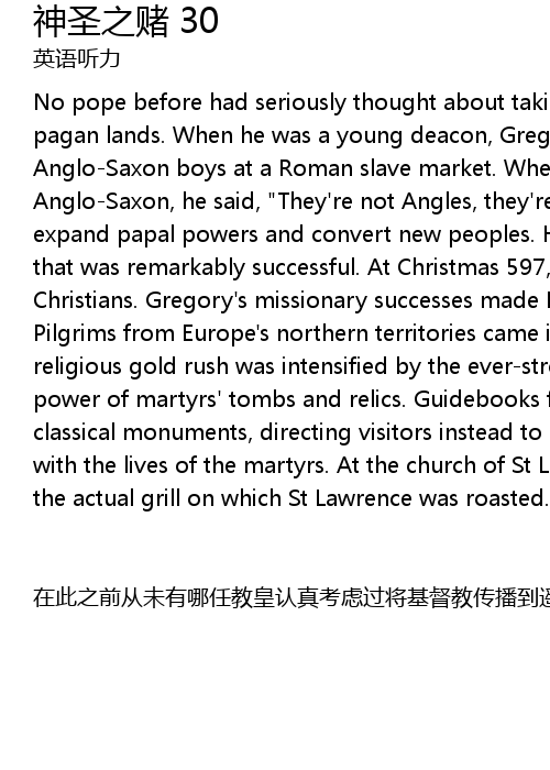 | No pope before had seriously thought about taking Christianity into faraway pagan lands. When he was a young deacon, Gregory had seen some fairhaired AngloSaxon boys at a Roman slave market. When he was told they were AngloSaxon, he said, " They' re not Angles, they' re angels." Now he was keen to expand papal powers and convert new peoples. He dispatched a mission to England that was remarkably successful. At Christmas 597, 10, 000 Angles were baptised as Christians. Gregory' s missionary successes made Rome the Holy City of the West. Pilgrims from Europe' s northern territories came in their thousands. The religious gold rush was intensified by the everstronger belief in the sacred power of martyrs' tombs and relics. Guidebooks from the period ignore Rome' s classical monuments, directing visitors instead to Christian sites associated with the lives of the martyrs. At the church of St Lorenzo, pilgrims could see the actual grill on which St Lawrence was roasted. | |