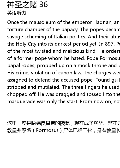 | 这里一度是哈德良皇帝的陵墓,现在成了堡垒、监牢乃至教皇的酷刑室。当时的意大利政坛尽是赤裸裸的勾心斗角,教皇们开始争权夺利,深陷其中。他们滥用教皇权威,把这座神圣之城跩入最黑暗的时期。公元897年,教皇斯蒂芬六世下达了一道指令,其扭曲、其恶毒之程度简直无以复加。他下令挖出他所憎恨的前任教皇的尸体。 教皇弗摩斯(Formosus)尸体已经干化,身着教皇长袍并由一个模拟的王座支撑着;他被放到圣议会前受审。他的罪行——违反教廷法规。圣议会命人宣读指控罪名,并安排副主祭为被告的教皇做辩护。弗摩斯的罪名经审成立,他被除去身上的衣物,尸体也遭到毁坏。他用来行教皇赐福仪式的三个手指被剁掉,随后被拖扔进台伯河。然而,这一出可怕的戏码仅仅是个开始。从今往后,(罗马)再无神圣可言。 |