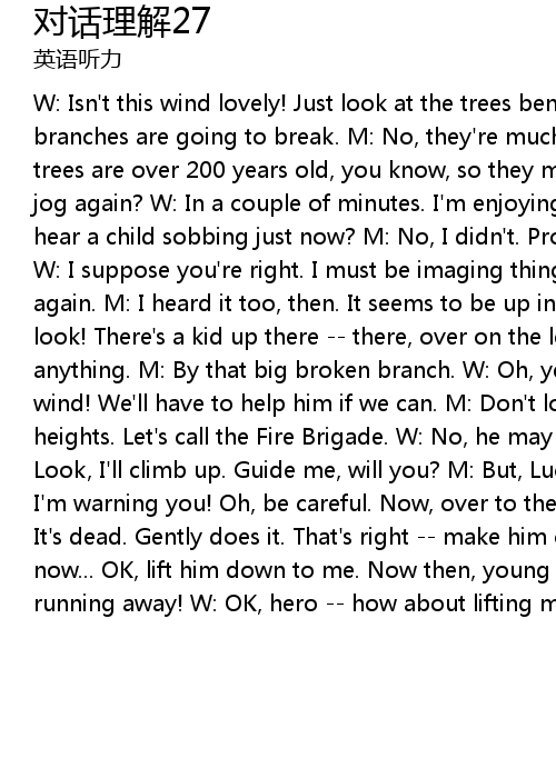 | W: Isn't this wind lovely! Just look at the trees bending -- I'm sure those big branches are going to break. M: No, they're much too strong for that. These trees are over 200 years old, you know, so they must be tough. Anyway, ready to jog again? W: In a couple of minutes. I'm enjoying the cookies. Hey -- did you hear a child sobbing just now? M: No, I didn't. Probably the branches creaking. W: I suppose you're right. I must be imaging things. Ah... listen, there it is again. M: I heard it too, then. It seems to be up in this tree somewhere... Yes, look! There's a kid up there -- there, over on the left. W: Where? I can't see anything. M: By that big broken branch. W: Oh, yes. He must be terrified in this wind! We'll have to help him if we can. M: Don't look at me -- I'm terrified of heights. Let's call the Fire Brigade. W: No, he may fall if we wait for them. Look, I'll climb up. Guide me, will you? M: But, Lucy, it's very dangerous -- I'm warning you! Oh, be careful. Now, over to the left. No! Not that branch. It's dead. Gently does it. That's right -- make him climb down after you. Slowly now... OK, lift him down to me. Now then, young man, what's your name? Hey, he's running away! W: OK, hero -- how about lifting me down now? |