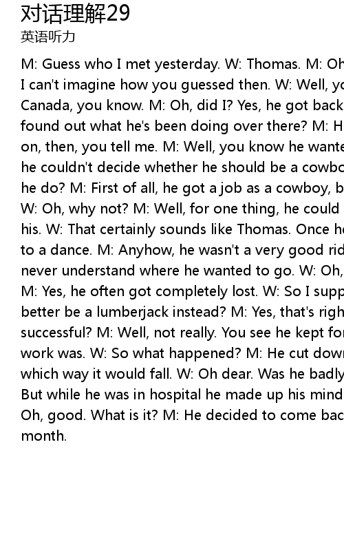 | M: Guess who I met yesterday. W: Thomas. M: Oh. Did somebody tell you? W: No. M: I can't imagine how you guessed then. W: Well, you told me he was back from Canada, you know. M: Oh, did I? Yes, he got back three days ago. W: And have you found out what he's been doing over there? M: He's told me all about it. W: Come on, then, you tell me. M: Well, you know he wanted to try an open-air life, but he couldn't decide whether he should be a cowboy or a lumberjack. W: So what did he do? M: First of all, he got a job as a cowboy, but he wasn't very good at it. W: Oh, why not? M: Well, for one thing, he could never remember which horse was his. W: That certainly sounds like Thomas. Once he forgot which girl he'd taken to a dance. M: Anyhow, he wasn't a very good rider, either. The horse could never understand where he wanted to go. W: Oh, yes. That must have been awkward. M: Yes, he often got completely lost. W: So I suppose he began to wonder if he'd better be a lumberjack instead? M: Yes, that's right. W: Was he any more successful? M: Well, not really. You see he kept forgetting how dangerous the work was. W: So what happened? M: He cut down a large tree and didn't realise which way it would fall. W: Oh dear. Was he badly hurt? M: Only a broken leg. But while he was in hospital he made up his mind what he really wanted to do. W: Oh, good. What is it? M: He decided to come back to England and get married next month. |