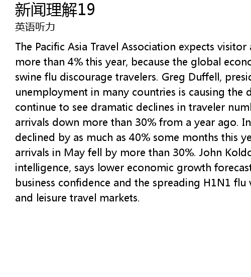 | The Pacific Asia Travel Association expects visitor arrivals in Asia to fall by more than 4% this year, because the global economic slump and concerns about the swine flu discourage travelers. Greg Duffell, president of PATA, says rising unemployment in many countries is causing the decline. Many tourism markets continue to see dramatic declines in traveler numbers. Singapore reports arrivals down more than 30% from a year ago. In South Korea, arrivals have declined by as much as 40% some months this year. In Japan, foreign visitor arrivals in May fell by more than 30%. John Koldowski, PATA's director of intelligence, says lower economic growth forecasts combined with a loss of business confidence and the spreading H1N1 flu virus have hurt bith the business and leisure travel markets. |