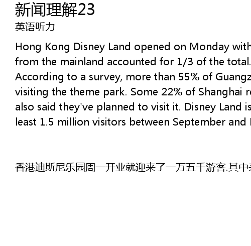 | 香港迪斯尼乐园周一开业就迎来了一万五千游客.其中来自大陆的游客占总数的三分之一,他们中的大多数来自广东.根据一项调查,有55%以上的广东居民表示有兴趣参观这个主题公园.大概22%的上海市民以及20%的北京市民也说他们打算去参观迪斯尼乐园.迪斯尼乐园预计在九月至十二月间会迎来至少150万游客. |