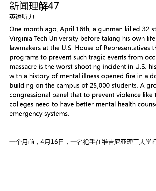 | 一个月前,4月16日,一名枪手在维吉尼亚理工大学打死了32名学生和教员以结束自己的生命。一群教育家告诉在美国众议院的国会议员:学校需要更好的方案以防止这样的悲剧事件的发生。在维吉尼亚理工大学发生的惨案是美国历史上最严重的枪击事件。一个有精神病的学生向宿舍和教学楼里25000名学生开火,一群教育者组织一个专门小组,以防止这样的暴力。大学需要有更好的心理健康咨询、沟通和应急系统 |