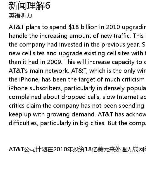 | AT&T公司计划在2010年投资18亿美元来处理无线网络中日益增长的问题。这次的投资大约比上年度的多出了2亿美元。具体的说,同2009年相比,AT&T公司将增加2000个新的基站,并且在现有基站升级三倍以上的光纤链路。这将增强AT&T公司的主要网络与手机信号发射塔的连接信号。AT&T公司作为唯一在美国出售iphone的无线网络开发商,在过去几年里一直是被批评的主要对象,对于许多iphone用户来说,特别是居住于人口稠密的城市用户,都抱怨电话掉线,上网连接慢,服务态度差等问题。有些批评者说,对于日益增长的需求,该公司根本就没有投资足够的钱去升级网络服务。对此,AT&T发表声明说网络升级正面临着一些困难,尤其是在大城市。但是公司会缩小差距的。 |
