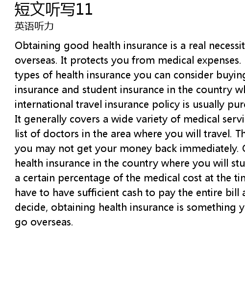 | Obtaining good health insurance is a real necessity while you are studying overseas. It protects you from medical expenses. There are often two different types of health insurance you can consider buying -- international travel insurance and student insurance in the country where you will be going. An international travel insurance policy is usually purchased in your home country. It generally covers a wide variety of medical services and you are often given a list of doctors in the area where you will travel. The drawback might be that you may not get your money back immediately. On the other hand, getting student health insurance in the country where you will study might allow you to only pay a certain percentage of the medical cost at the time of service. So you don't have to have sufficient cash to pay the entire bill at once. Whatever you decide, obtaining health insurance is something you should consider before you go overseas. |
