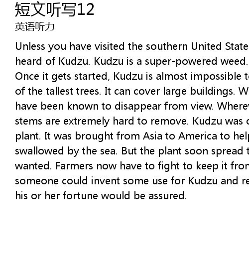 | Unless you have visited the southern United States, you probably have never heard of Kudzu. Kudzu is a super-powered weed. It is a strong climbing plant. Once it gets started, Kudzu is almost impossible to stop. It climbs to the tops of the tallest trees. It can cover large buildings. Whole barns and farm houses have been known to disappear from view. Wherever it grows, its sick twisting stems are extremely hard to remove. Kudzu was once thought to be a helpful plant. It was brought from Asia to America to help protect the land from being swallowed by the sea. But the plant soon spread to places where it wasn't wanted. Farmers now have to fight to keep it from killing other plants. If someone could invent some use for Kudzu and remove it from southern farmland, his or her fortune would be assured. |